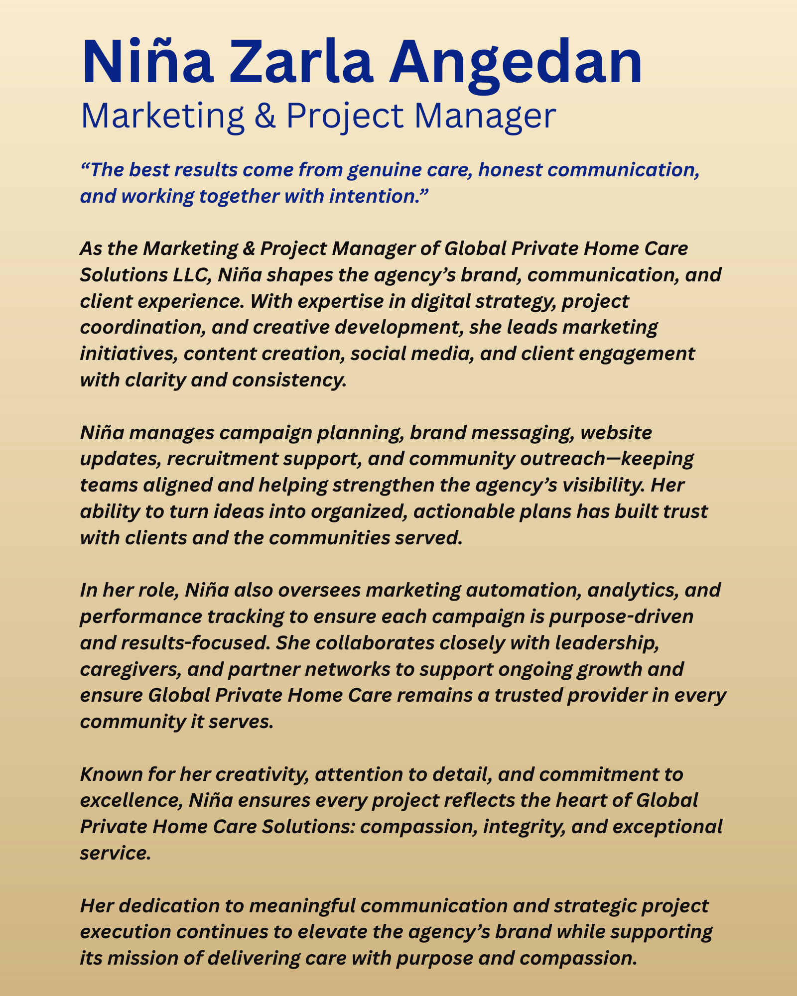 At Global Private Home Care Solutions, LLC, our vision is to provide compassionate, reliable, and high-quality in-home care that allows individuals to live safely and comfortably in their homes.